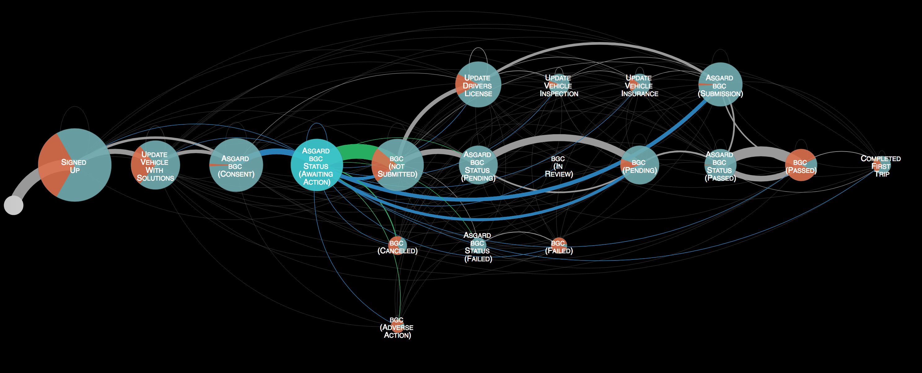 Create visualizations for a data set tracking progress through a Web application. Used node and link; A node was a point in the progression and the links indicate transition to next set of nodes. Node size represent number of users and thickness of links indicate percentage of the outbound using that link.